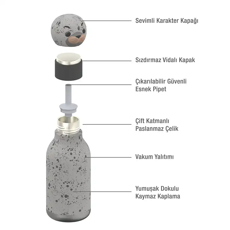 Sevimli yumuşak hayvan başı çıkarılabilir ve sızdırmaz kapağın üzerine vidalanarak oturtulur.