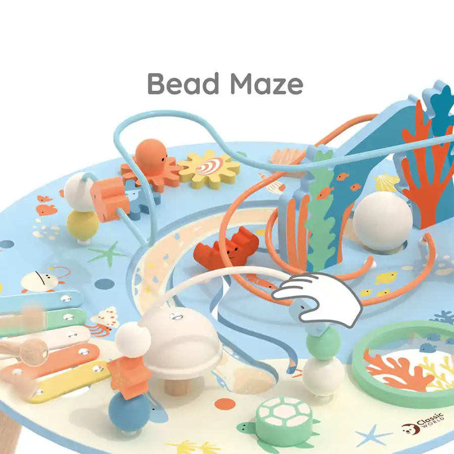 Döndürülecek dişliler, kaydırılacak boncuklar, müzik yolculuğunuza başlamak için bir ksilofon, bir kaplumbağa düğmesi, kaydırılıp zili çalınacak bir top ve vurulacak bir davul ile çocuklar Classic World Ahşap Çok Fonksiyonlu Aktivite Masası ile oynarken çok eğlenecekler.