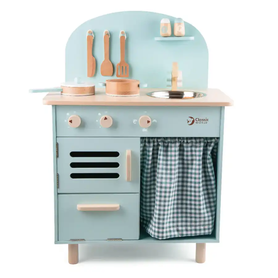 Küçük şeflerin yemek yapma pratiği yapabilmesi için harika bir mutfak! Musluk, ocak, mikrodalga, fırın, dolap gibi aksesuarlarla birlikte gelen Classic World Ahşap Mavi Retro Mutfak’ta çocuklar, meyve yıkama, sebze doğrama, yemek pişirme ve tuz & karabiber serpiştirme gibi aktiviteler yapabilirler.