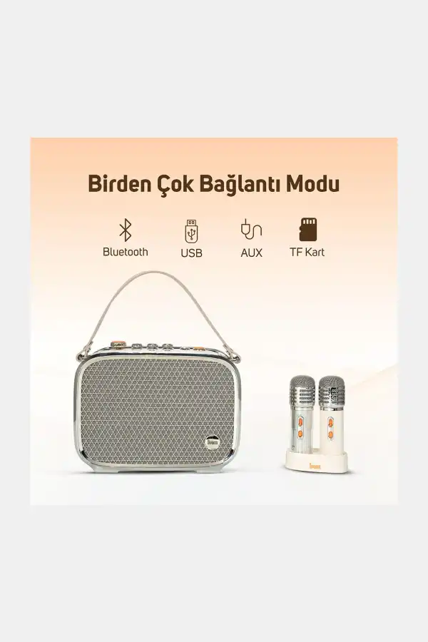 Hoparlörün kutusunda 2 adet profesyonel UHF dinamik kablosuz karaoke mikrofonu yer alır