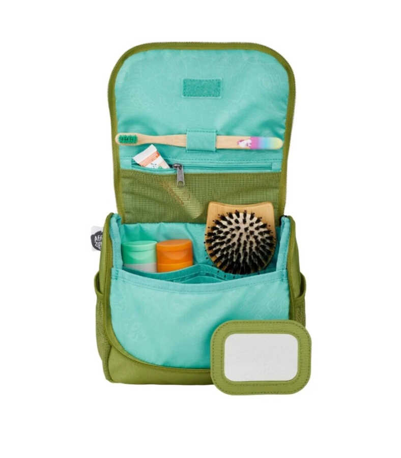 Its large zippered main compartment is ideal for small care items.