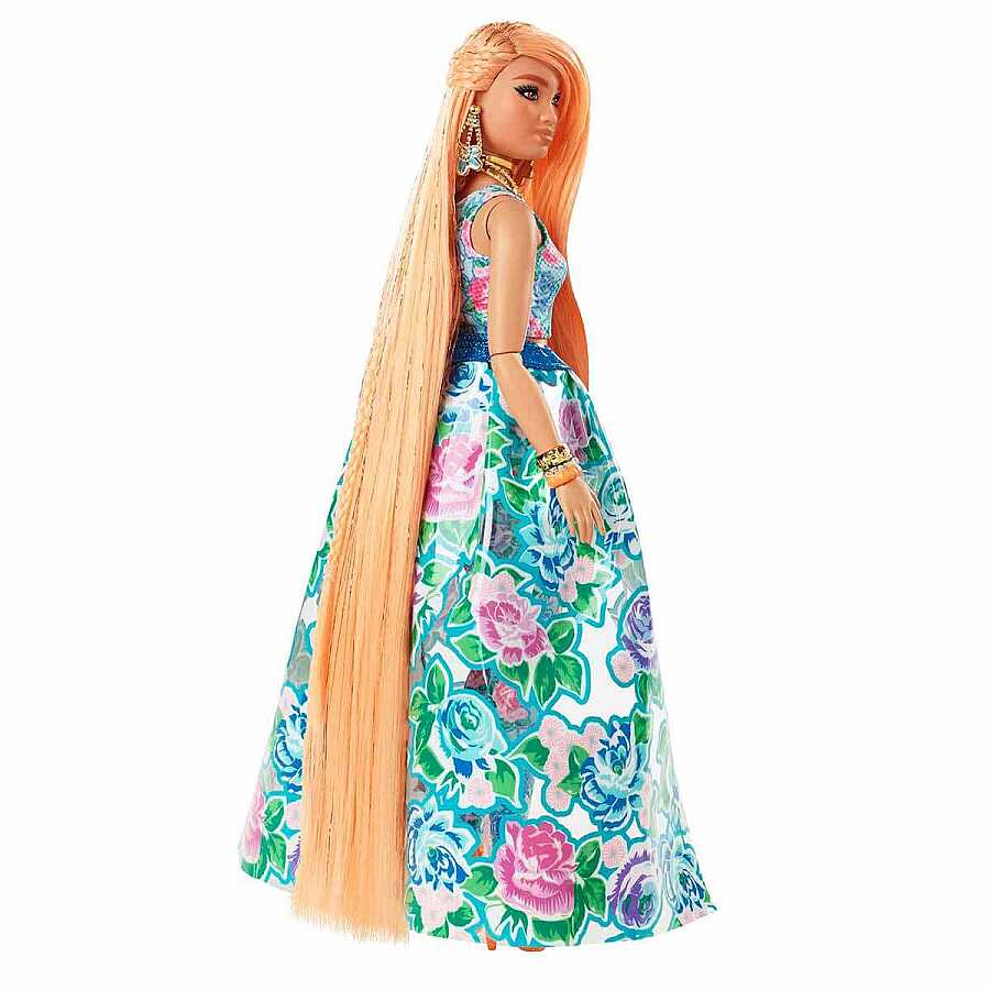 Her long, bright orange hair with glittering, braided details adds chic to Barbie®'s look. Her glamorous two-piece dress and leggings, all-over floral patterned, showcase her confident style.