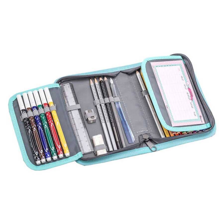 The interior compartment features two fold-over flaps, one of which covers two transparent foil pockets on the front, both of which contain a handy printable timetable for holding paper or cards.