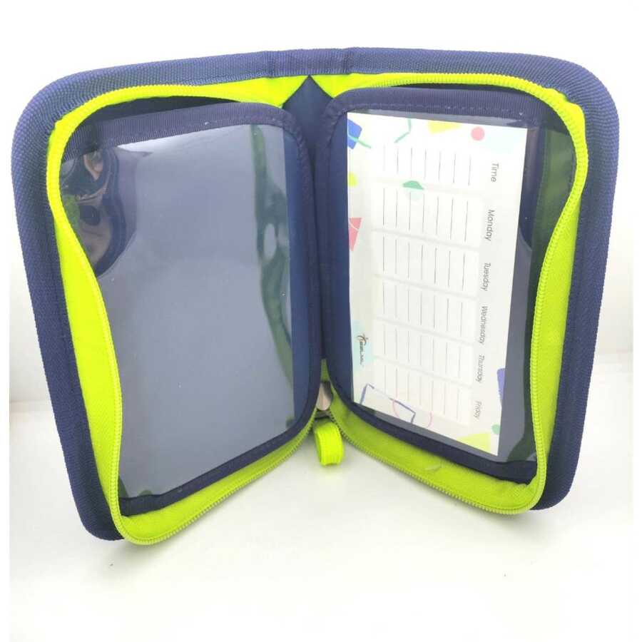 The interior compartment features two fold-over flaps, surrounding the front are two clear foil pockets, one containing a handy printed timetable, both useful for holding papers or cards.
