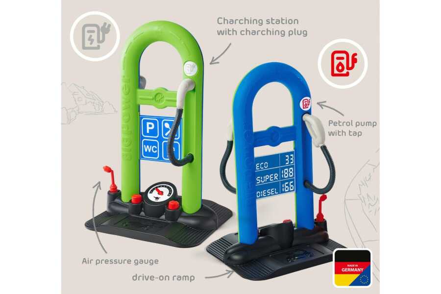 The innovative service station is inspired by real fuel pumps and charging stations.