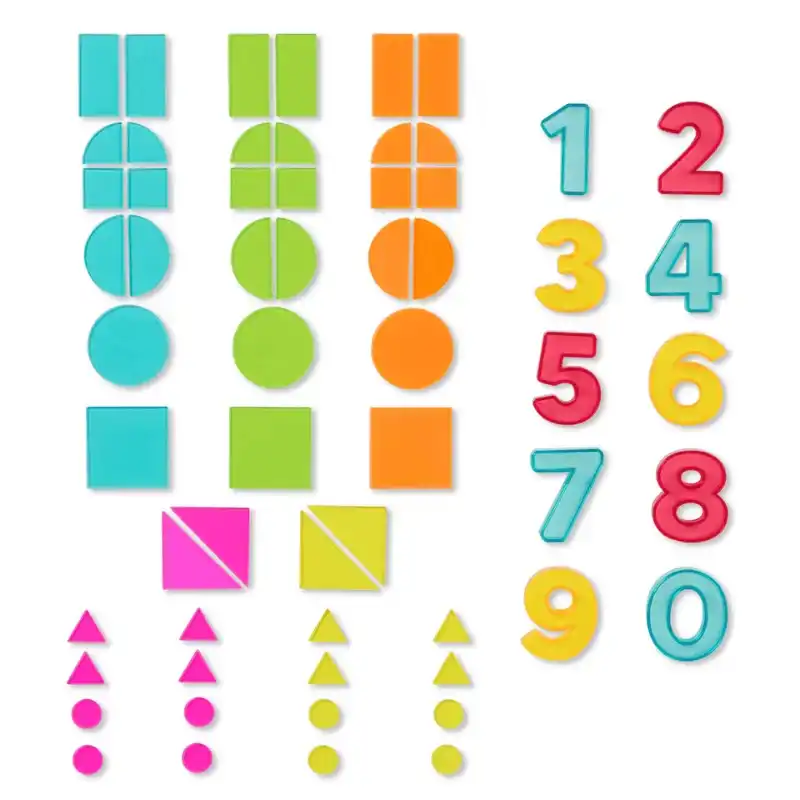 Package Contents: 5 brushes, 1 eraser, 10 number blocks, 50 various geometric pieces, 3 transparent line drawings, 1 storage box.