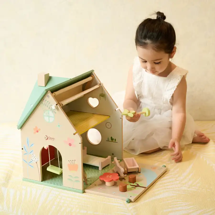 The Classic World Wooden Cottage includes a variety of accessories such as a swing, rocking horse, garden cart, drawing table and bridge to encourage creative play.