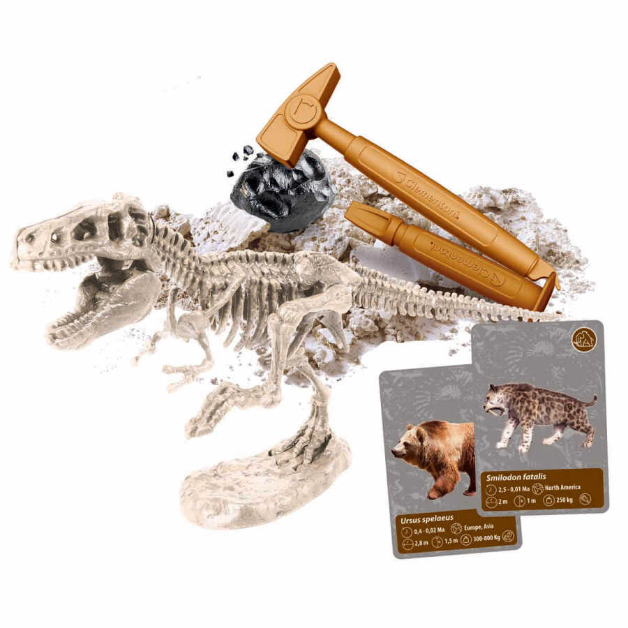In the box; VR headset, T-Rez skeleton, human skeleton, real meteorite brick, hammer and chisel, thermoformed volcano piece, gypsum bag, sodium bicarbonate, beaker, mixer, spatula, teaspoon, tempera paints, food coloring, mixed experiment board, cards and map/instructions.