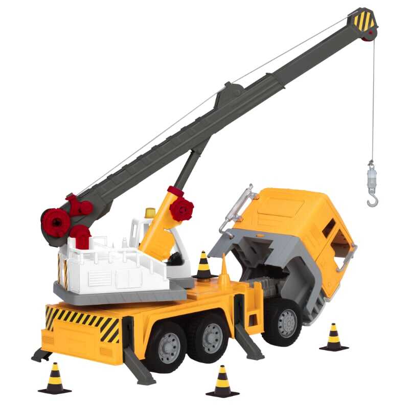 Features a fully functional crane arm that extends, releases the rope, hooks and lifts the load up, up and away! First, position the traffic cones and lower the hinged outriggers.