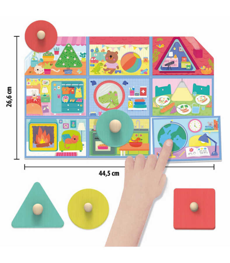 9 Wooden Shapes: Includes different geometric shapes (triangle, square, circle).