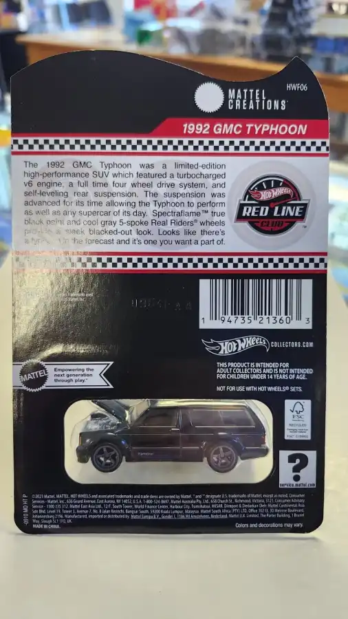 Hot Wheels RLC HWF06 features the 1992 GMC Typhoon SUV with a Spectraflame black ZAMAC body and Real Riders wheels with real tires.