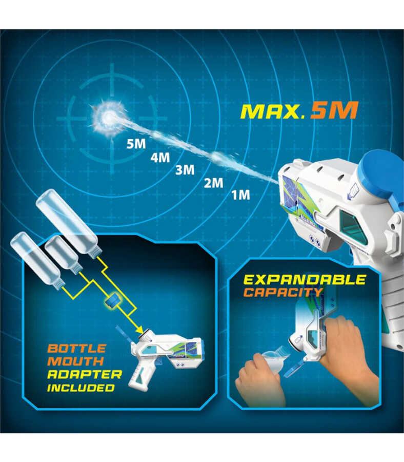 High-capacity tank: Long-lasting play with 100ml internal + 200ml extra tank.