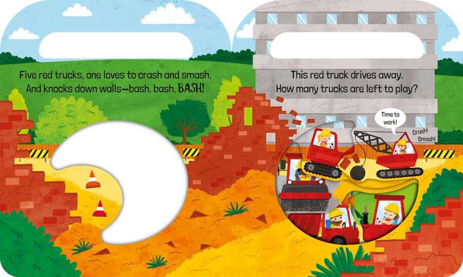 Bu "Say ve Taşı" karton kitapta, beş tane hareketli kırmızı kamyonu bulmanız gerekiyor. Her kamyonun ne yaptığını keşfetmek için kalıp kesimli pencerelerden bakın ve 5'ten 1'e kadar saymak için sayfayı çevirin. Kafiyeli hikaye, sesli okunacak birçok kelimeyle eğlenceli ve hareketli çizimler, inşaat sahasında bulunacak şeylerle dolu. Sağlam karton sayfalara sahip kitap, hareket halindeyken okuma keyfi için kalıp kesimli bir tutamağa sahiptir.