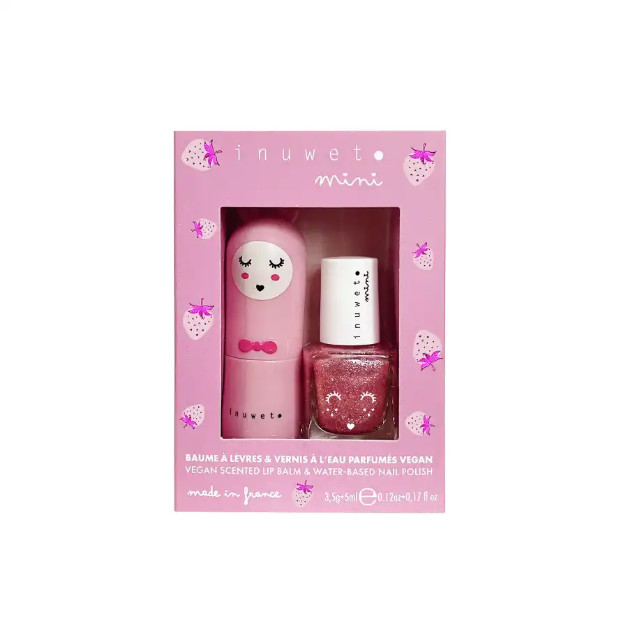 Tatlı ve lezzetli çilek kokusuna sahip dudak balmı ve pembe renkte oje. Doğal formüller, %100 vegan ve Fransa’da üretilmiştir.