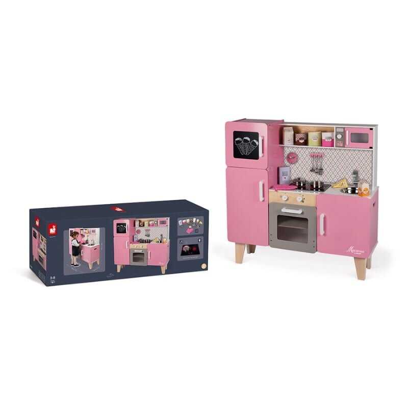 This fully equipped kitchen includes an oven, microwave, a cabinet with magnetic doors and a refrigerator, 3 buttons with sound effects, a stainless steel sink, a clock and a blackboard.