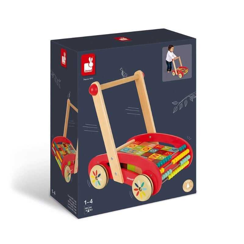 Let's go on a colorful journey! This wooden play car is perfect for children who can walk and want to have fun carrying their belongings! The basket contains 30 wooden alphabet blocks consisting of lowercase letters, uppercase letters and numbers.