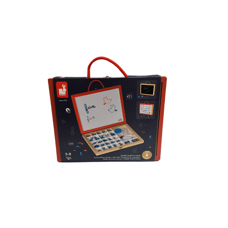4 activities combined in 1 set: A magnetic board with letter recognition to learn the alphabet; compartments for sorting and storing letters and accessories; an erasable magnetic whiteboard to learn first words and a chalkboard to practice writing with chalk.