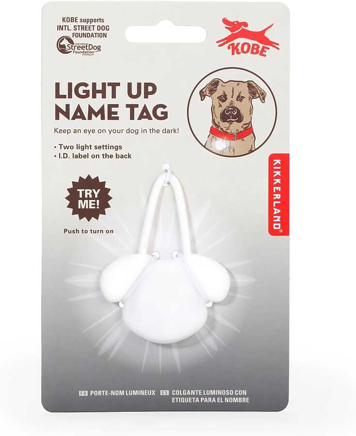 Choose one of 2 LED lighting modes: flashing or steady light. Write your dog's name and phone number on the back with a permanent marker. Made of white silicone.