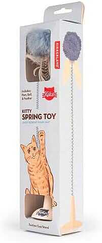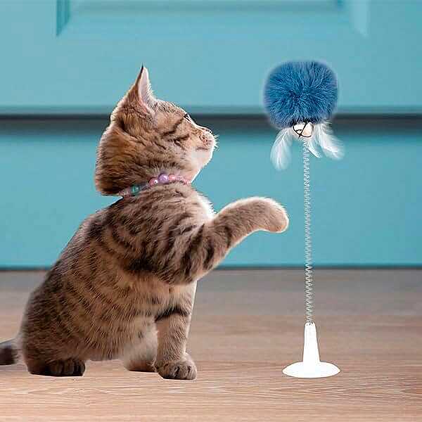 By attaching this spring-loaded toy to a flat, smooth surface, you can keep your cat playing even when you're away! Includes: pompom, feathers, bell, and suction cup.