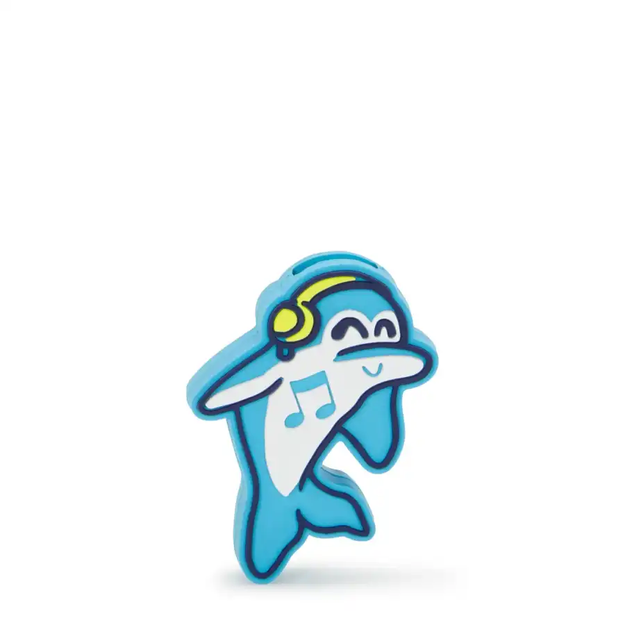 The vibrantly colored dolphin figure is a practical accessory that can be attached to a bag's zipper and can also be used as a keychain.
