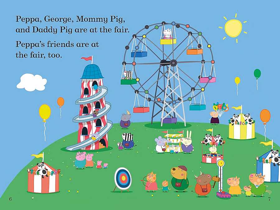Peppa, George, Mother Pig and Father Pig are at the fair. "We love fairs!" says Peppa. But Father Pig doesn't like the fair.
