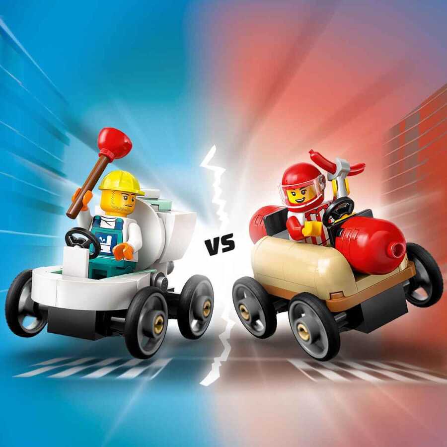 • A soapbox car toy packed with details for creative play: kids place the hot dog and toilet soapbox cars at the top of the ramp and press a lever to launch them towards the starting line.