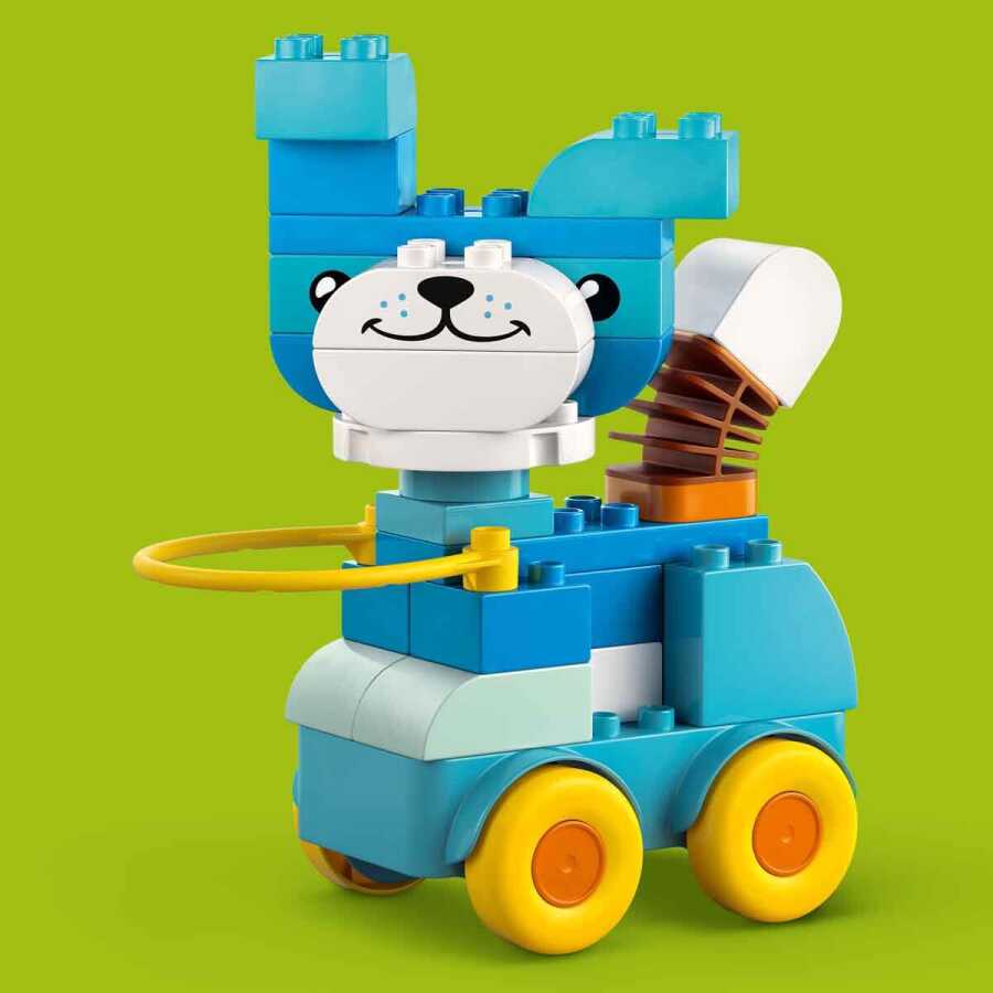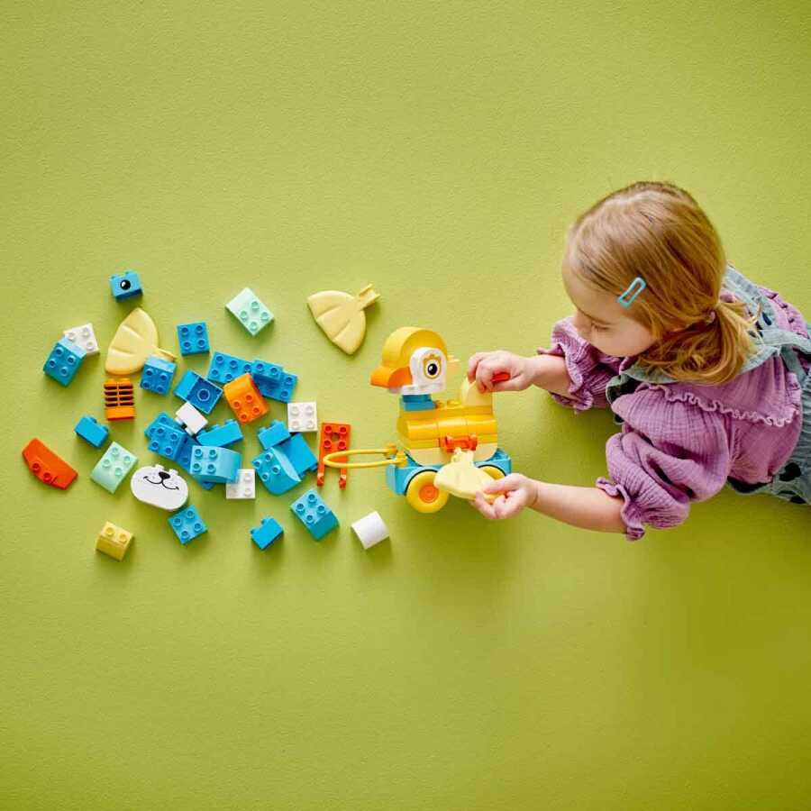 Young animal lovers will find endless ways to enjoy imaginative play as they build the duck, fish or dog toy – or even design brand new animals! Preschoolers who love LEGO DUPLO vehicle toys can have fun building their figures on the wheeled base and then quickly pushing them around or pulling them with the handle.