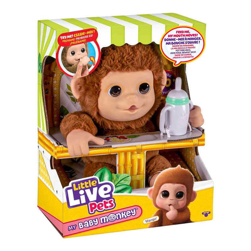 You'll be entertained by every movement and sound! The baby monkey is hungry, so you need to feed her! Mango moves her mouth while sucking her finger and bottle, creating a very realistic experience.