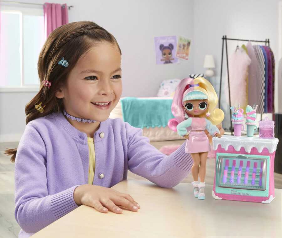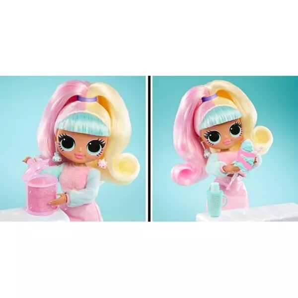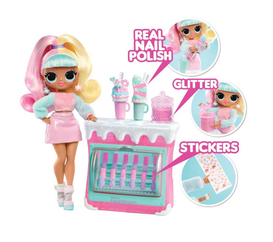Surprise Sweet Nails OMG Doll - Candylicious Sprinkles Sweet Shop, featuring an ice cream refrigerator, unique nail accessories, signature pastel colors and fabulous hair, including all-new character Candylicious! Help run the fabulous Candylicious Sprinkles Sweet Shop! Unbox the amazing surprises so you can make your own ice cream cones and serve the best milkshakes! First, open the ice cream refrigerator to reveal 24 beautiful, pastel-colored, popsicle-like nails that can be placed and decorated on your own nails! Take a closer look at the nails to discover sweet-themed details, including ice cream cones, donuts and more! Then, discover 2 incredibly fun milkshakes and open the bottles to reveal two trendy nail polish colors to apply to your nails! Check out the sweet pink candy jar and open the jar to reveal REAL nail glitter! Now you're ready to get creative and personalize your own nails.