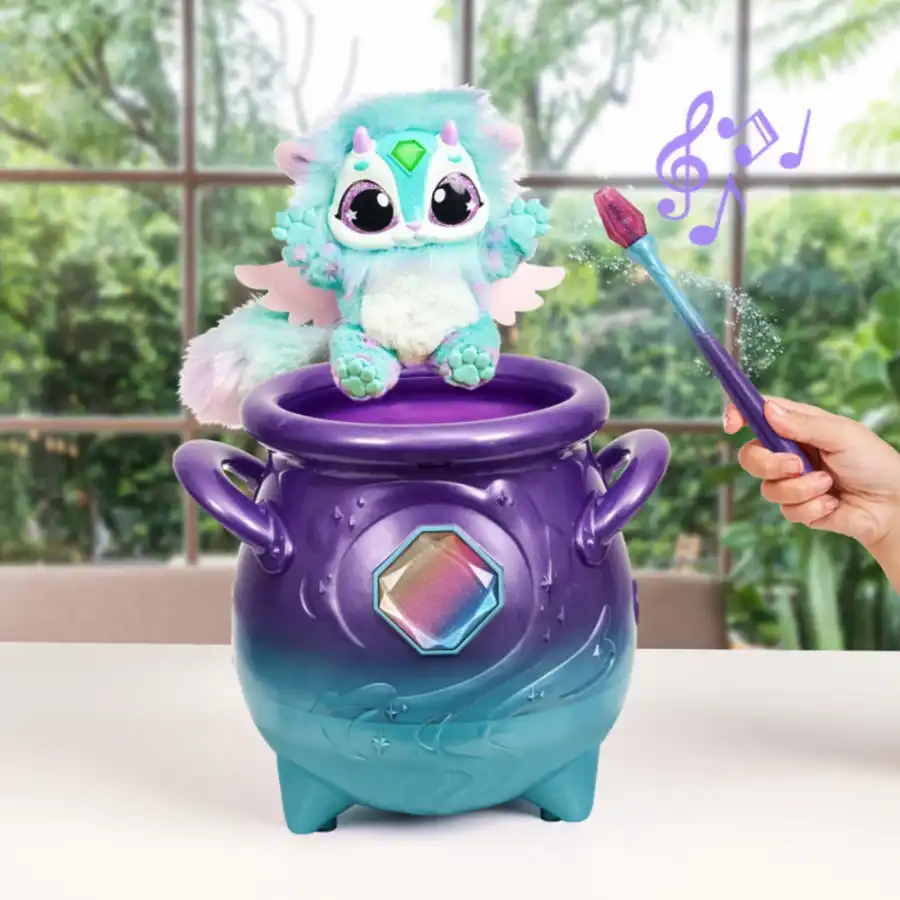 When the Magic Wand is tapped three times and the words "Magicus Mixus" are said, the magic begins and mist rises from the cauldron, followed by a magical friend.