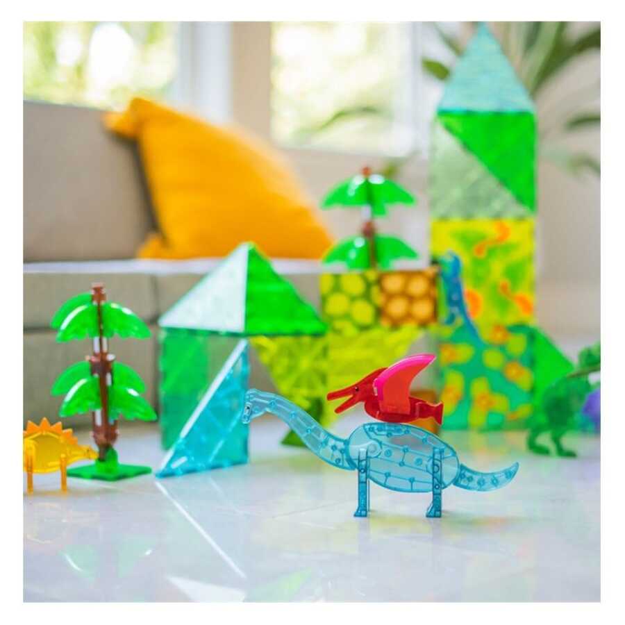 * Includes 16 extra-large tiles — 4 times larger than traditional magnetic tiles* The first extendable magnetic trees with lush, magnetic leaves* Spark curiosity about STEAM subjects, including paleontology -6 Dinosaur Figures: Pteranodon (red), T-Rex (green), Stegosaurus (yellow), Velociraptor (blue), Triceratops (purple) and Brachiosaurus (Slate Blue) -6 XL Squares -6 XL Right Triangles -4 XL Equilateral Triangles -8 Classic Small Squares -2 Classic Right Triangles -16 Dino Leaves -2 Extendable Tree Base -Dimensions: 18×2.