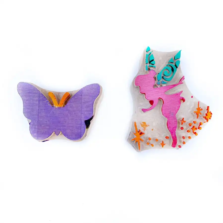 Finger paint vehicles set6 pieces of 100ml finger paint colors: yellow-red-blue-green-orange-purple2 wooden molds made of linden tree between 8-10cm without chemicals or additives1 apron suitable for ages 2-64 tampon sponges You can also use wood prints in play dough since the prints are natural, we recommend applying olive oil before playing.