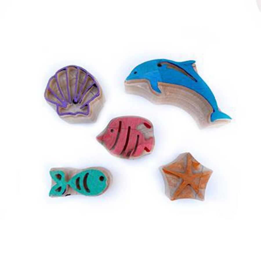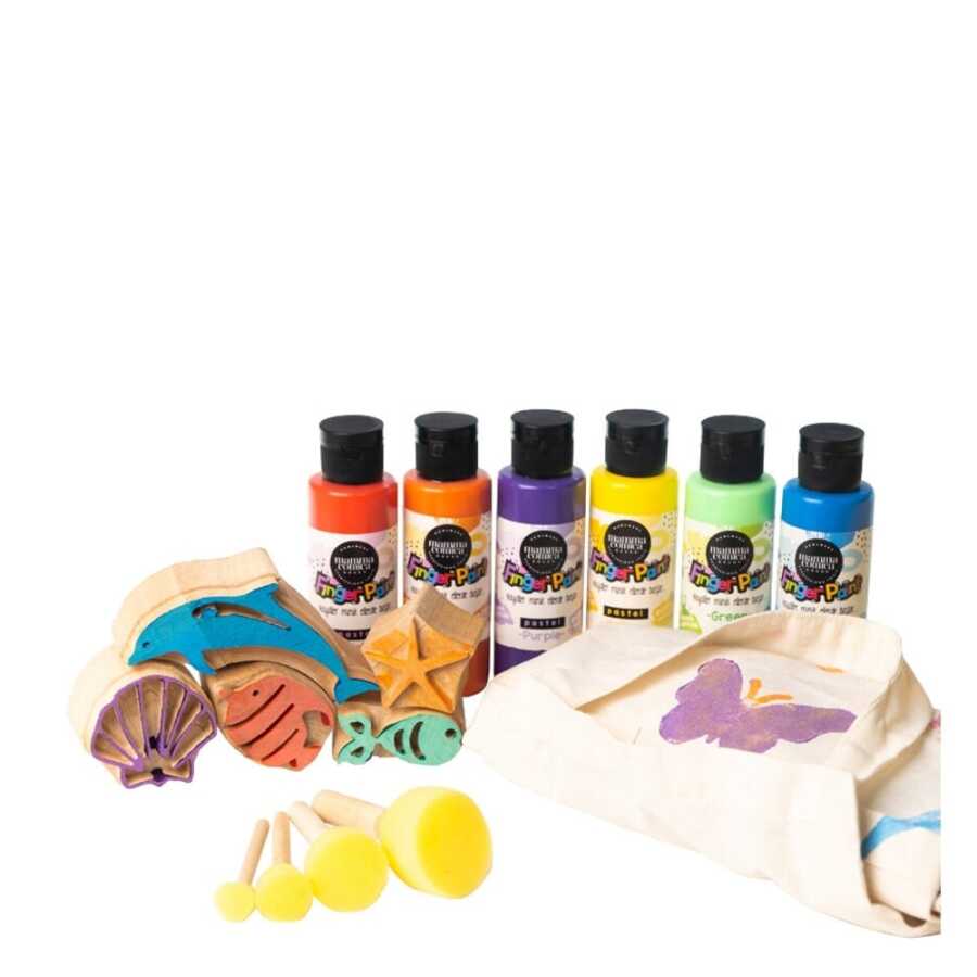 Finger paint sea creatures set6 pieces of 100ml finger paint colors: yellow-red-blue-green-orange-purple5 wooden molds made of linden tree between 4-10cm in size that do not contain chemicals or additives1 apron suitable for ages 2-64 tampon spongesYou can also use the wooden prints in mammacomicadough play dough.