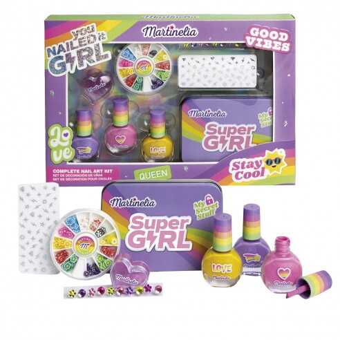 Martinelia Super Girl Nail Care Set Contents: 3 Nail Polishes, Sticker, Jewelry Stickers, Nail Decoration Wheel, Lip Gloss, Tin Box IMPORTANT WARNINGS: All cosmetic products may contain allergens and ingredients that may cause intolerances.