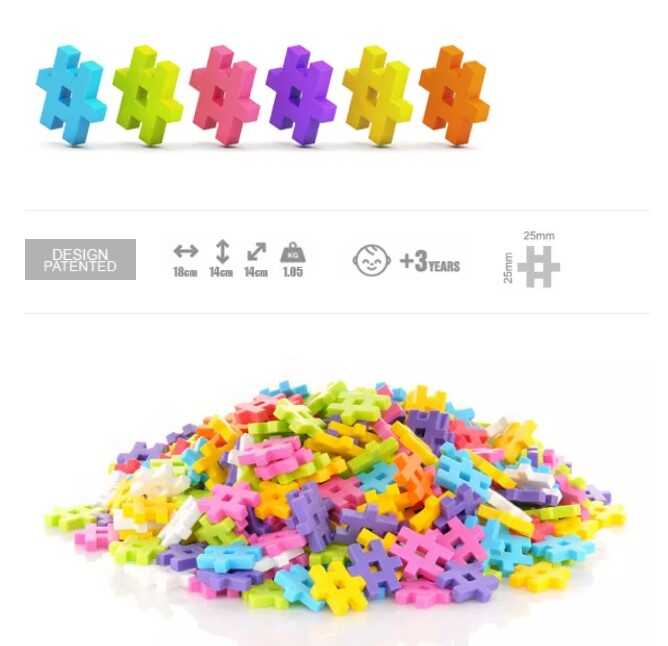 Children can build both flat-surface and 3D structures with these pieces; the only limit is their imagination.