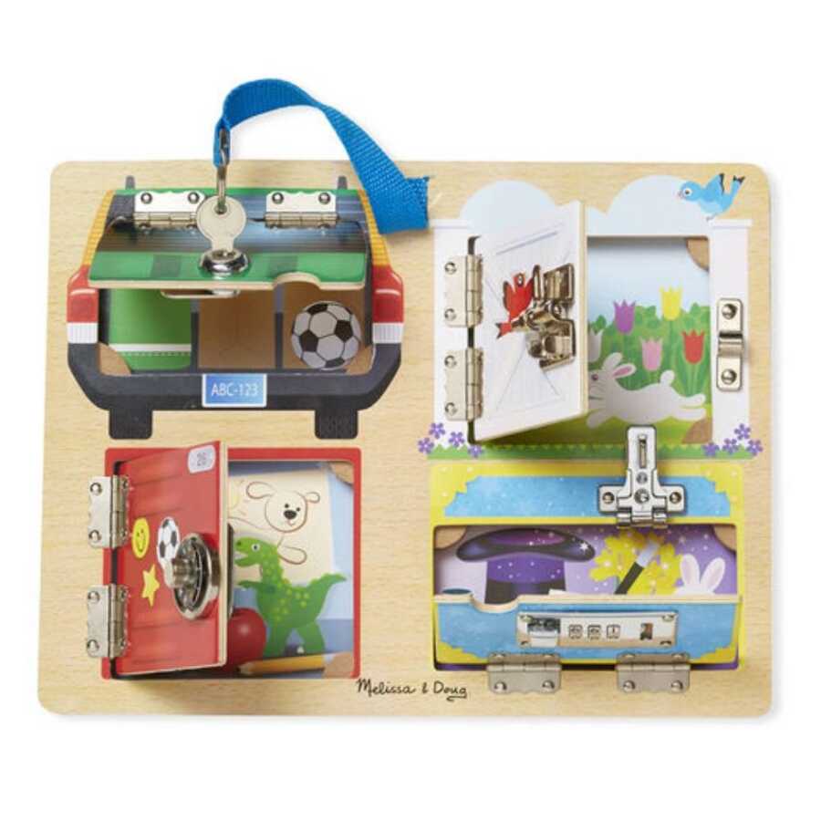 The Melissa & Doug Wooden Lock and Locksmith Board is a fun toy set designed for children to develop manual dexterity, problem-solving skills, and attention.