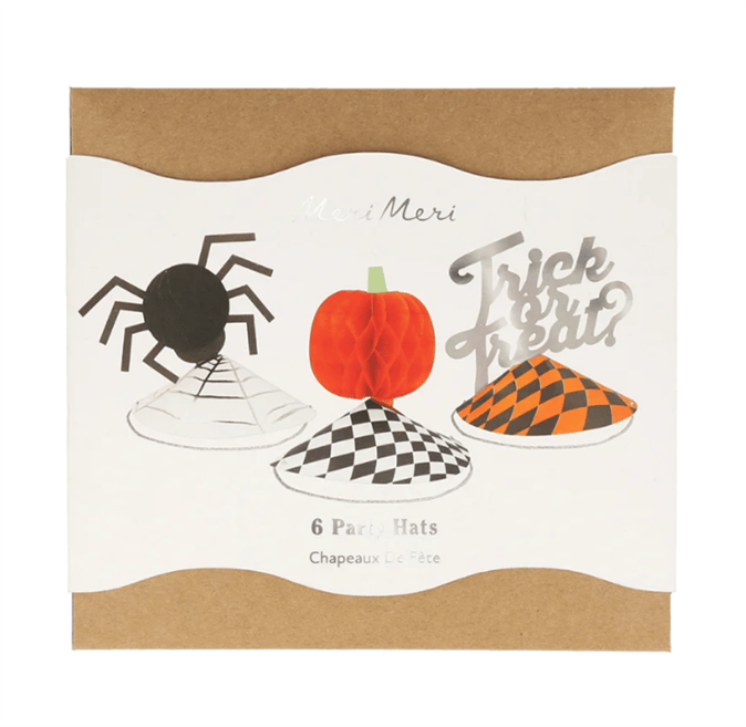 Meri Meri is the first and most beloved brand that comes to mind when it comes to parties! Party excitement extends from London to Türkiye; with over 50 party themes, you can find unique party supplies, colorful party costumes, decorations, party supplies, and a wide range of party products, as well as hundreds of designer products! Black honeycomb spider Orange pumpkin Shiny silver foil "Trick-or-treat" words All hat tops are reinforced with wire to maintain their shape throughout the night Shiny silver foil hat bases Thin silver round elastic cord for comfortable wear Suitable for ages 3+ Made from sustainable FSC paper Pack of 6 with 3 designs Product dimensions: 11.