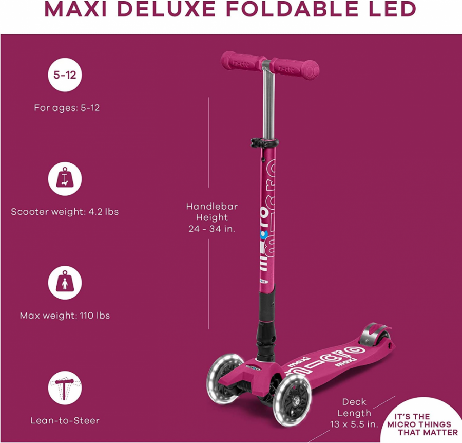 You can purchase the Micro Maxi Deluxe Foldable Berry Red (Led) Scooter MMD095 with the HUPALUPA STORE privilege and gift it to your loved ones.