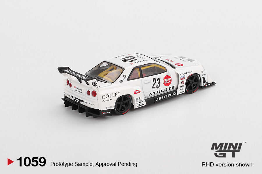 Mini GT 1/64 Nissan LB-ER34 Super Silhouette ATHLETE/COLLET is a special aggressive-design diecast model of the Nissan Skyline ER34 with Liberty Walk Super Silhouette conversion. The ATHLETE/COLLET livery design stands out with eye-catching graphics and sponsor details that give the car a race character.