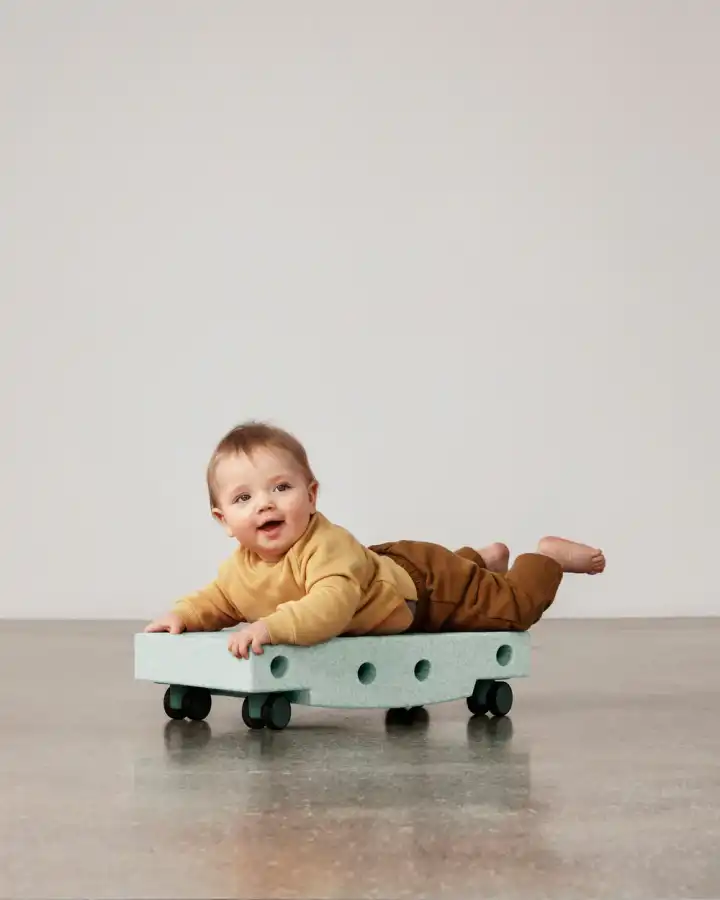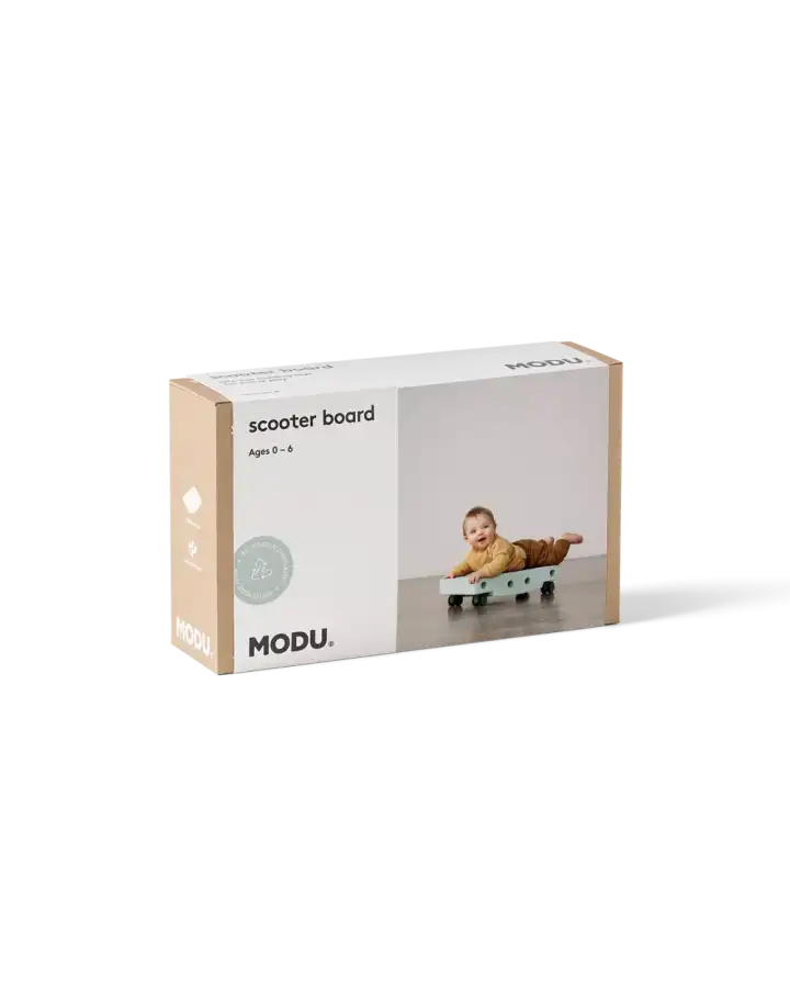 This MODU Scooter Board is a simple yet highly versatile toy for developing your baby's or toddler's basic motor skills. You can move them around on it during tummy time exercises, or remove the wheels and let it rock back and forth. Even the simplest movements and sensory stimuli can put a smile on your baby's face — the fun is just beginning. As your child grows, they can experience the freedom of turning and moving independently using their whole body. When you remove the wheels, the product transforms into a balance board; You can also create more advanced structures by combining it with other parts of the MODU system.