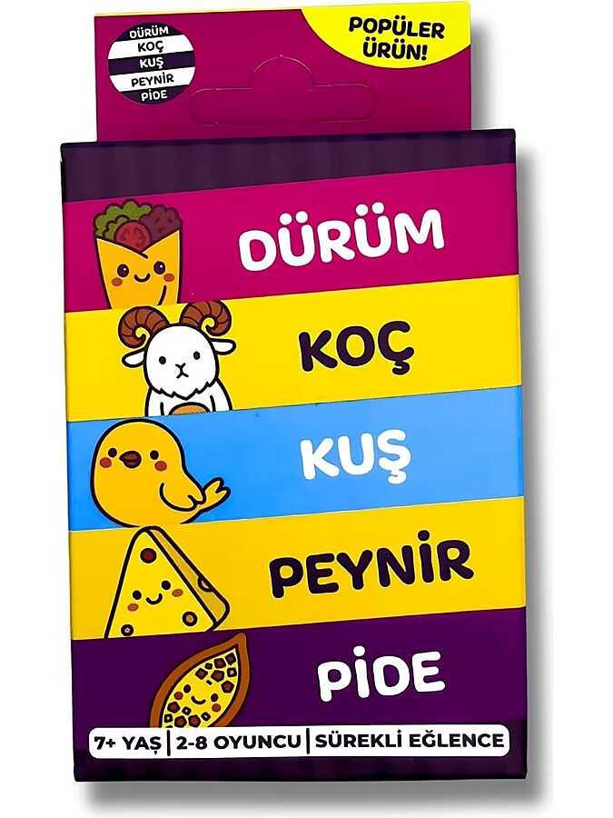 Notify me when its in stockÇabuk Reflex kutu oyunu; “Dürüm – Koç – Kuş – Peynir – Pide” kelime döngüsünde, bu eşleşmeler gerçekleştiğinde kartlara hızla şaplak atarak oynanır.