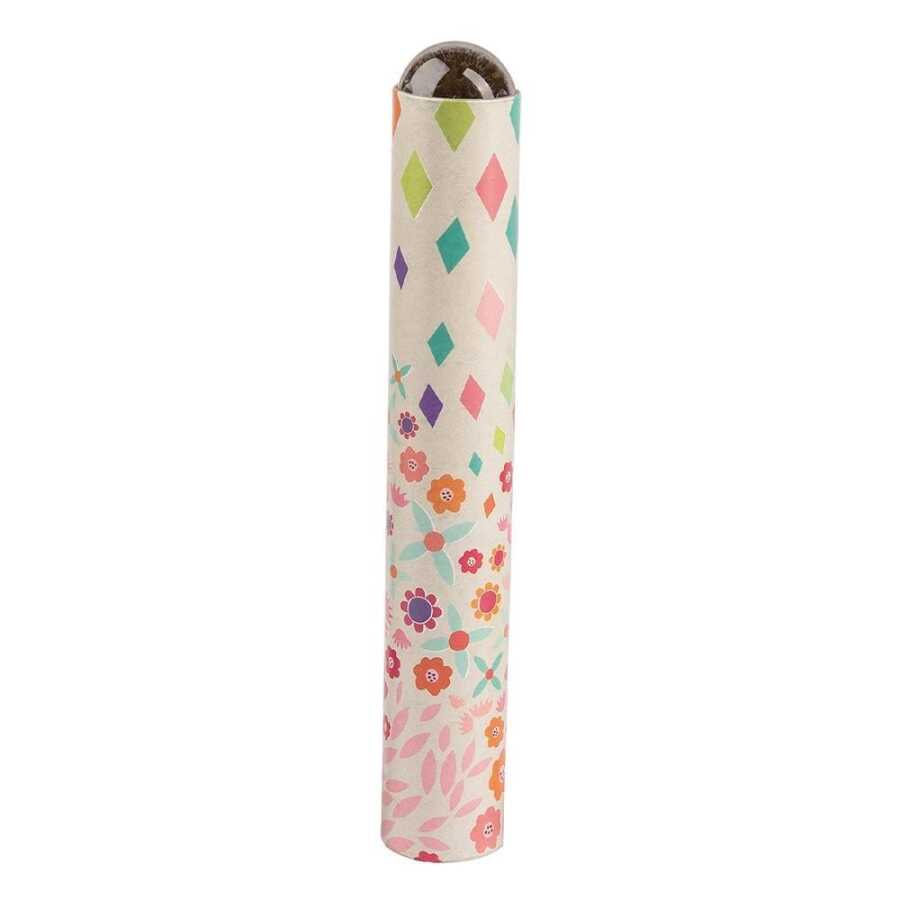 A cardboard tube decorated with floral patterns and multicolored illustrations has a magnifying glass at its end.