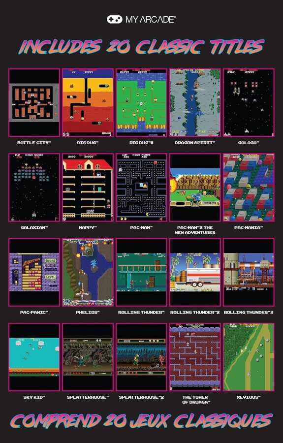 Discover 20 Legendary Bandai Namco™ Games: BATTLE CITY™, DIG DUG™, DIG DUG™, DRAGON SPIRIT™, PAC-MAN™ 2: The New Adventures, ROLLING THUNDER™, ROLLING THUNDER™, ROLLING THUNDER™ 2, ROLLING THUNDER™ 3, SKY KID™, SPLATTERHOUSE™ 2, THE TOWER OF DRUAGA™.