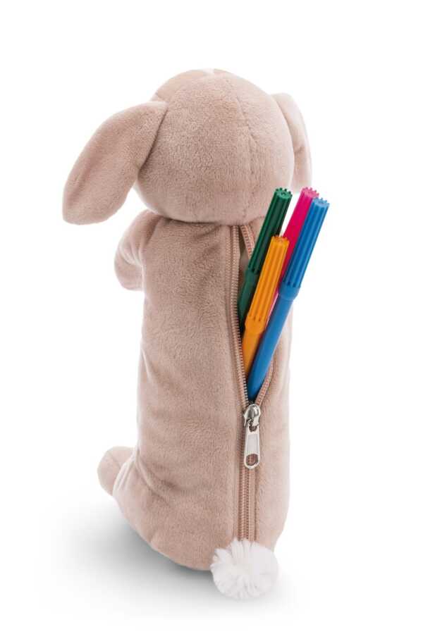 Made of NICI plush material, the rabbit stands upright thanks to the padding in its hips and can be stuffed with any writing utensil or cosmetic.