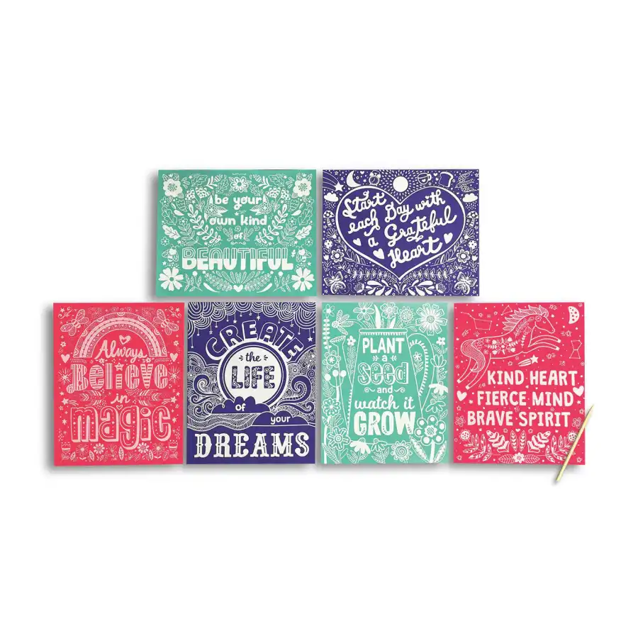 Foil scratch-off art set featuring inspirational quotes: 6 colorful scratch-off cards, 1 wooden scratch-off pen.