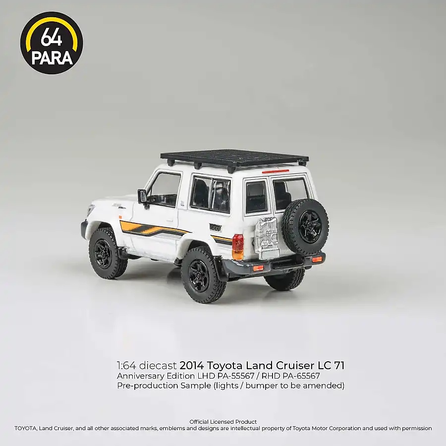Notify me when its in stockThe Toyota Land Cruiser LC71, a 1/64 scale model, embodies the legendary off-road spirit of the 70 series in a special 2023 anniversary edition. Prepared with the simplicity of white and anniversary-specific details, this model stands out with its classic angular lines and robust stance. Produced with high precision by Para64, this piece is poised to become a favorite for both true off-road enthusiasts and professional diecast collectors. Realistic body details and a high-quality paint finish bring the legacy of the legendary LC71 to the miniature world.