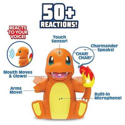 Are you ready to interact with Charmander? He has over 50 reactions! He has a touch sensor on his head! His arms move! He can talk and respond to your voice! His mouth and tail also light up.