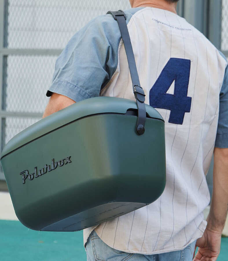 It offers an elegant vintage design that keeps your drinks and food cold without compromising on style. The leather handle is in its natural color with two gold-plated side buckles that allow the lid to be held, carried by hand, or hung over the shoulder.