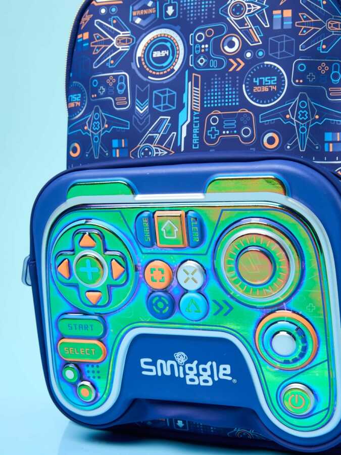 Check out the remote control character zip and the awesome game print! Backpack & School Bag FeaturesThree zipped compartments, double zipped main compartmentDouble drink bottle sleevePadded adjustable shoulder strapsCarrying handle15" laptop compartmentInternal name tagH 42cm x W 32cm x D 23cmWashing/Care Instructions: Do not machine wash, can wipe clean with a damp cloth.