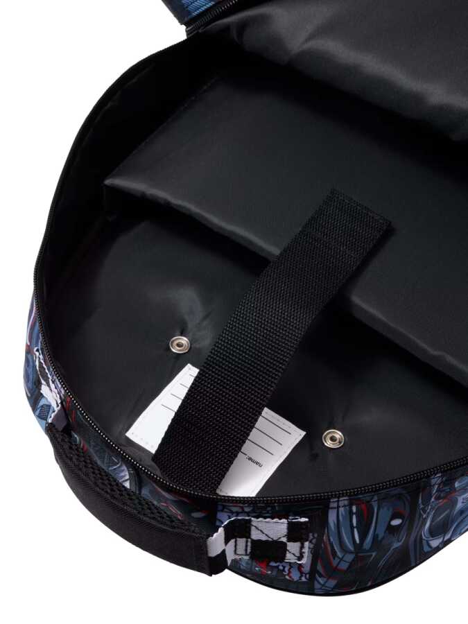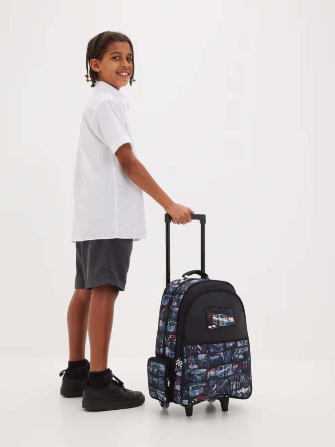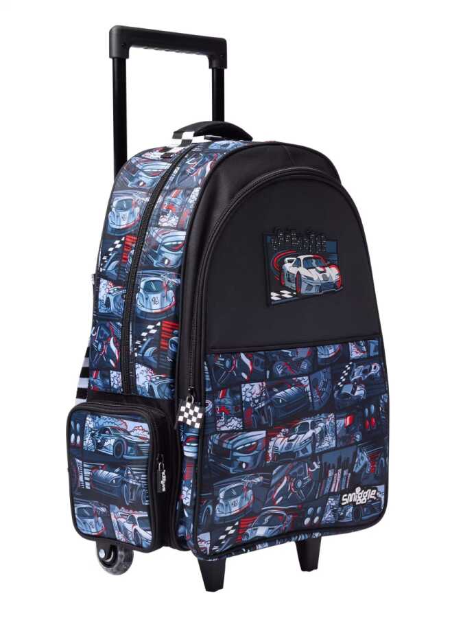 It features 4 zippered compartments with heaps of space for snacks, technology, stationery, and more, along with great design details like motion-activated light-up wheels, a super fun silicone badge, and a cool graphic print.